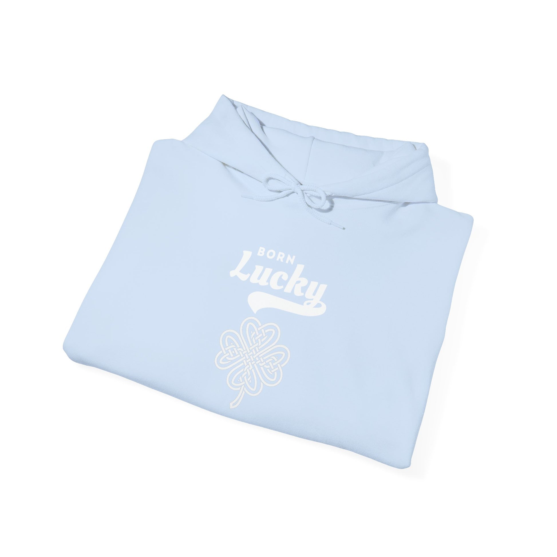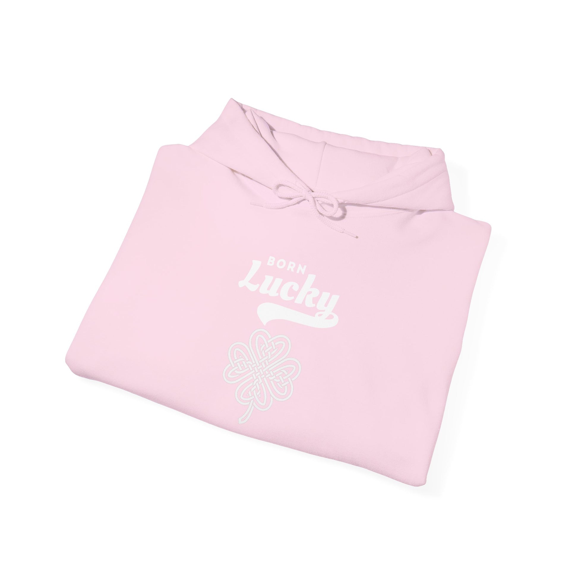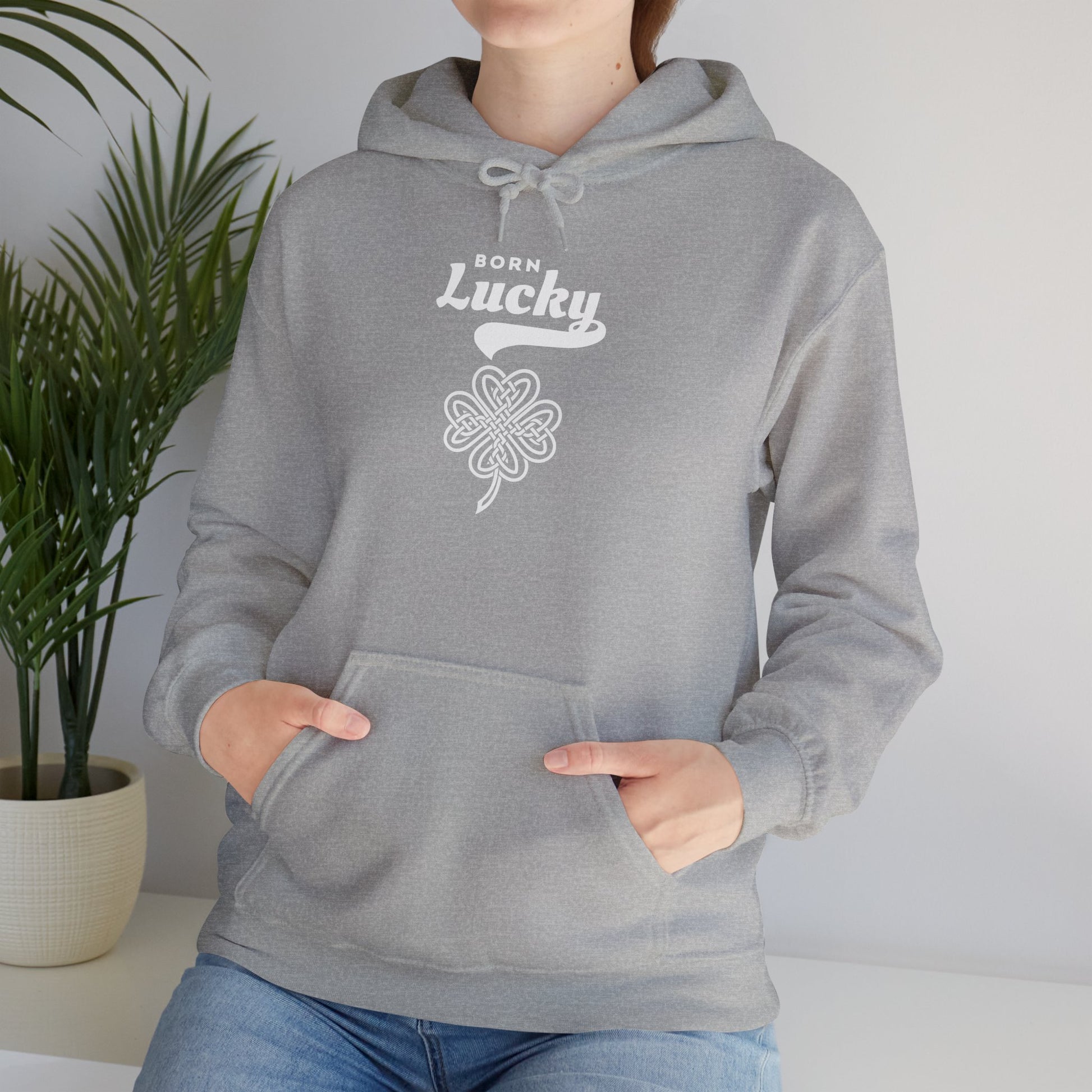 A soft, roomy hoodie made for cool mornings and slow nights. The midweight fleece holds warmth without weight, and the double-lined hood with color-matched drawcord keeps a clean, classic silhouette. A subtle, hand-drawn four-leaf clover and the small "Born Lucky" script sit on the chest—easy to layer, easy to live in. Wear it to coffee runs, late-night drives, or while curled up with a novel. It’s the kind of sweatshirt that becomes part of your daily rhythm: comfortable, low-key, and quietly optimistic.