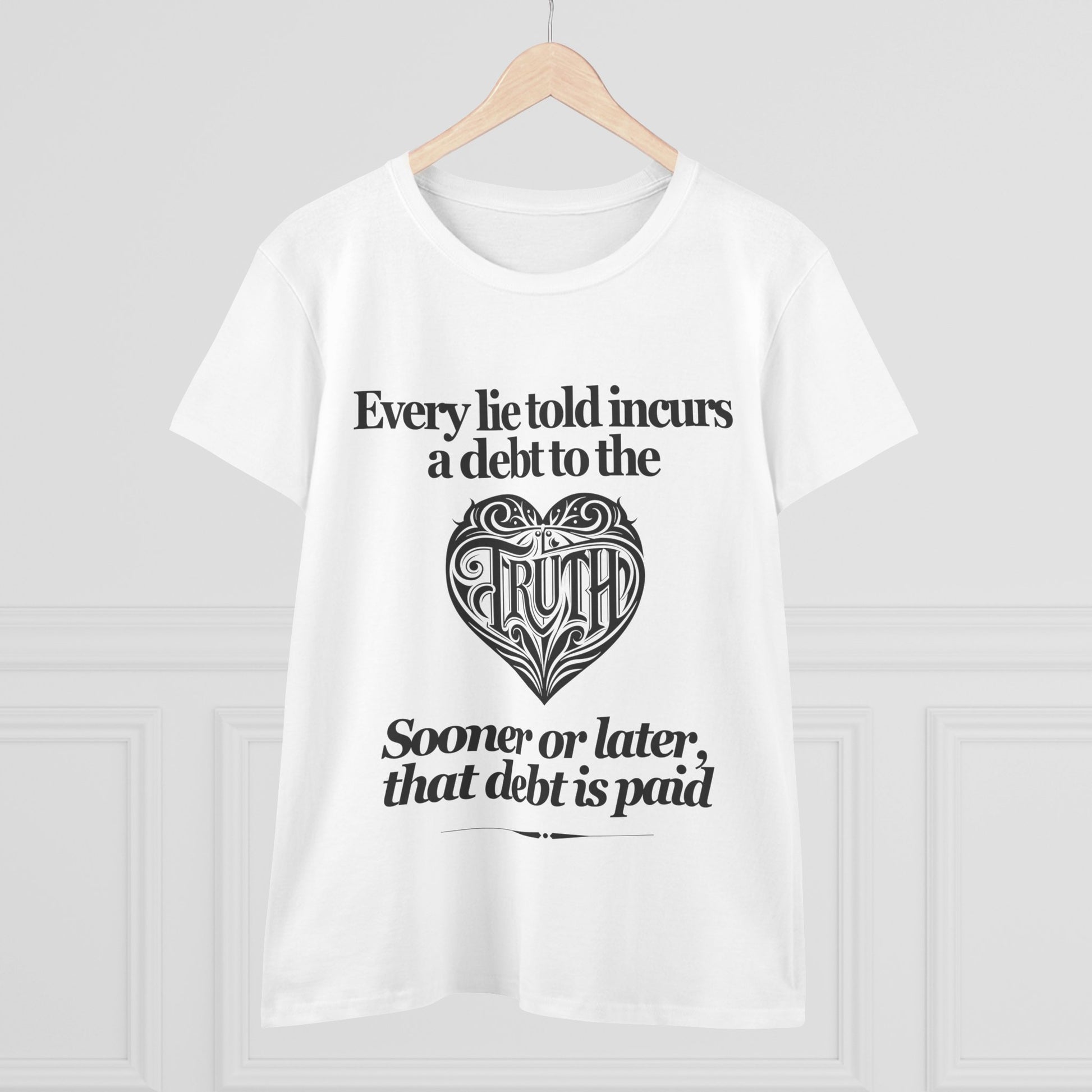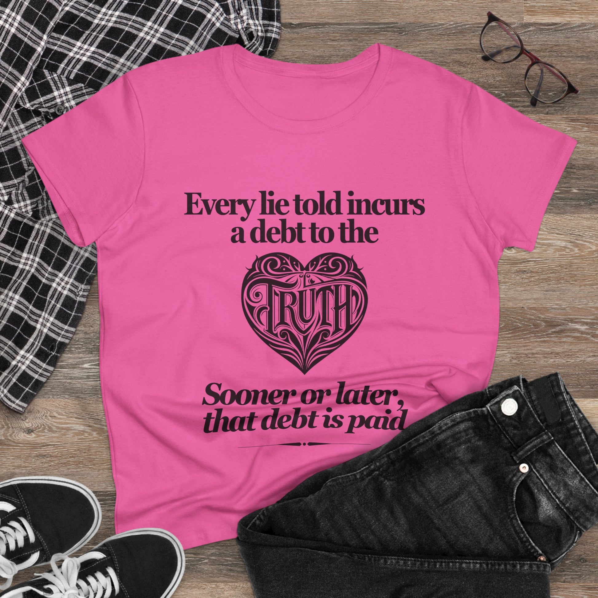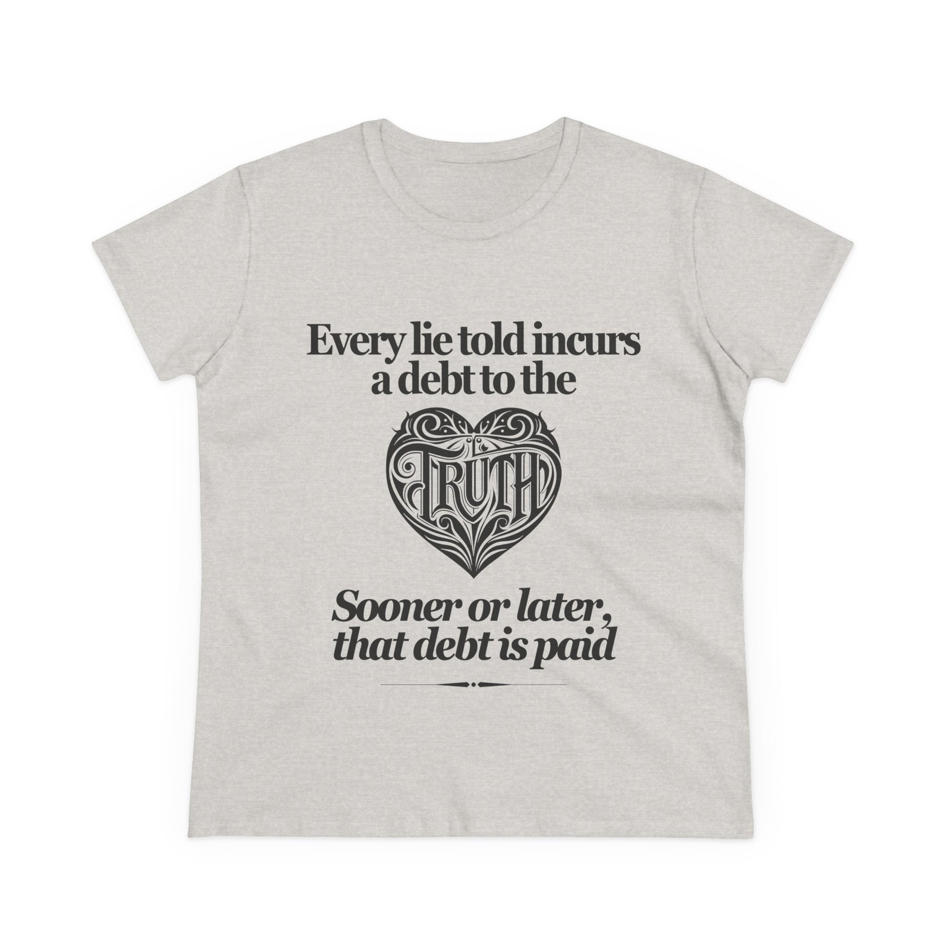 A soft midweight cotton tee with a quiet, thought-provoking message across the chest. The vintage-style heart emblem and classic serif type feel like a page torn from an old journal — reflective, honest, and slightly worn-in. Lightweight but substantial, the semi-fitted cut drapes gently for everyday wear. It’s the kind of shirt you reach for when you want your outfit to speak with restraint: a conversation starter for slow walks, late-night talks, or mornings when you need a reminder that truth has weight and time pays its dues.