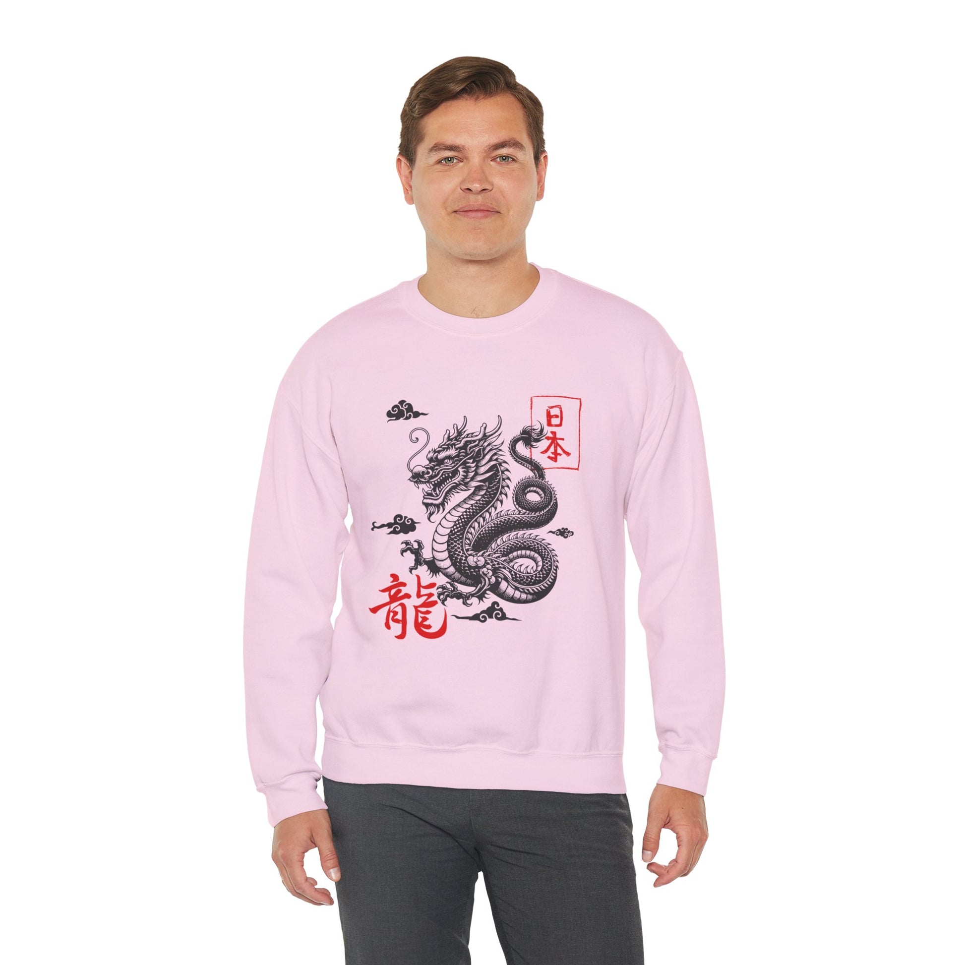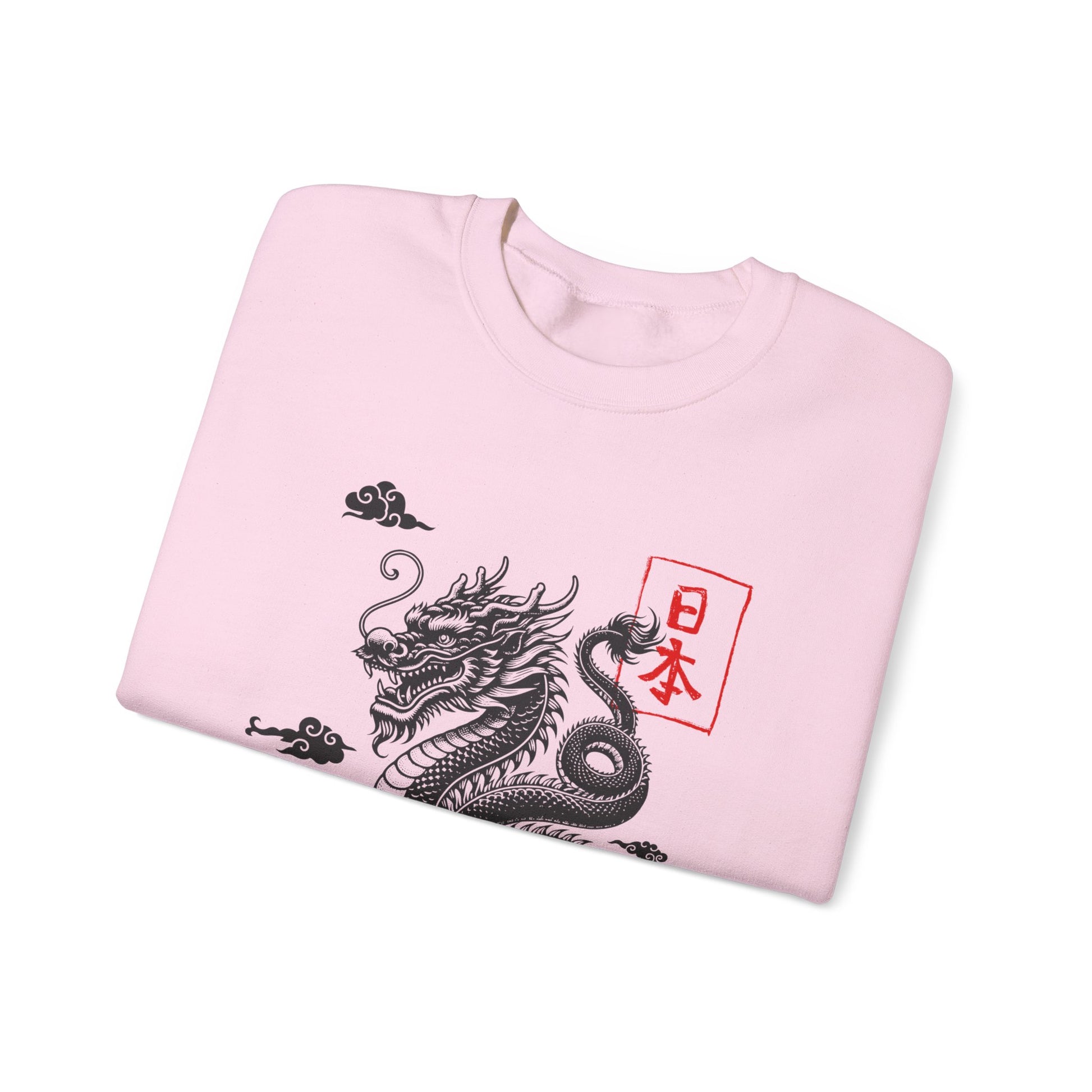 A clean, soft white crewneck sweatshirt featuring a detailed ink-style dragon illustration with subtle red kanji accents. The dragon sits centered on the chest, surrounded by small cloud motifs that add movement and traditional East-Asian flair. The look pairs minimalist modern streetwear with classic sumi-e inspired art — wearable art that reads calm, confident, and quietly bold. Slip it on for slow mornings, gallery runs, or low-key evenings when you want something that feels curated but effortless. The medium-heavy cotton-poly blend holds print detail well and the ribbed collar and cuffs keep the silhouette tidy wash after wash.
