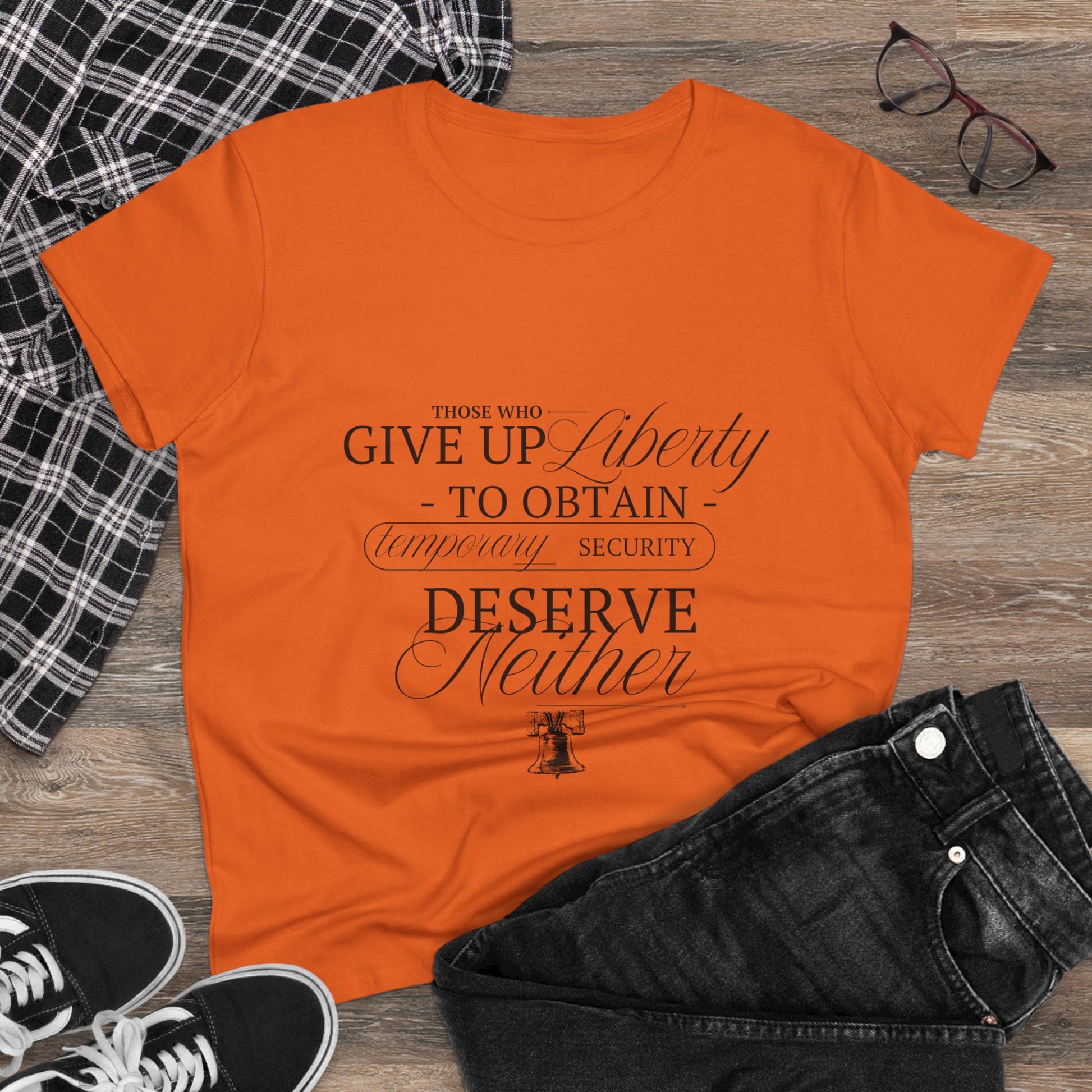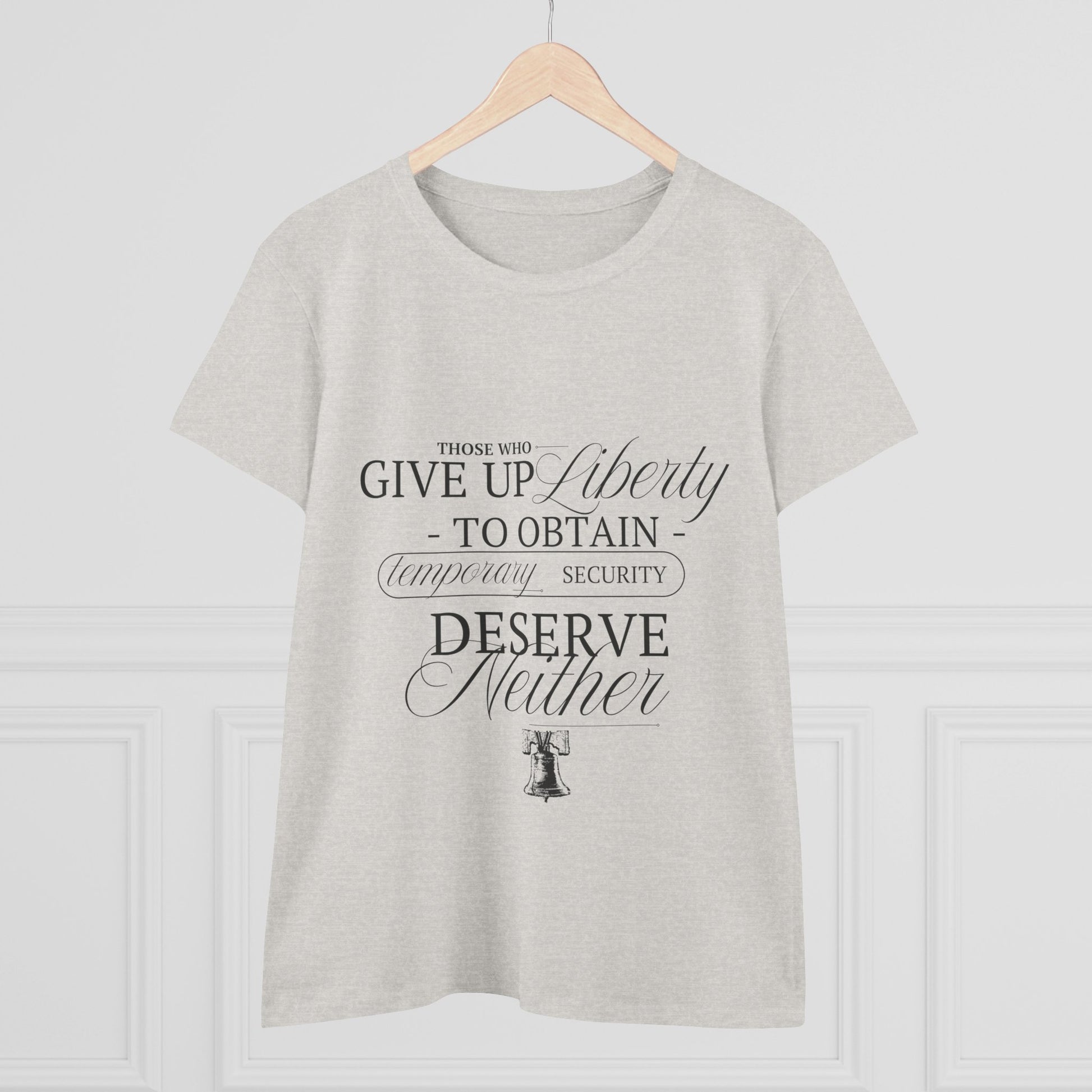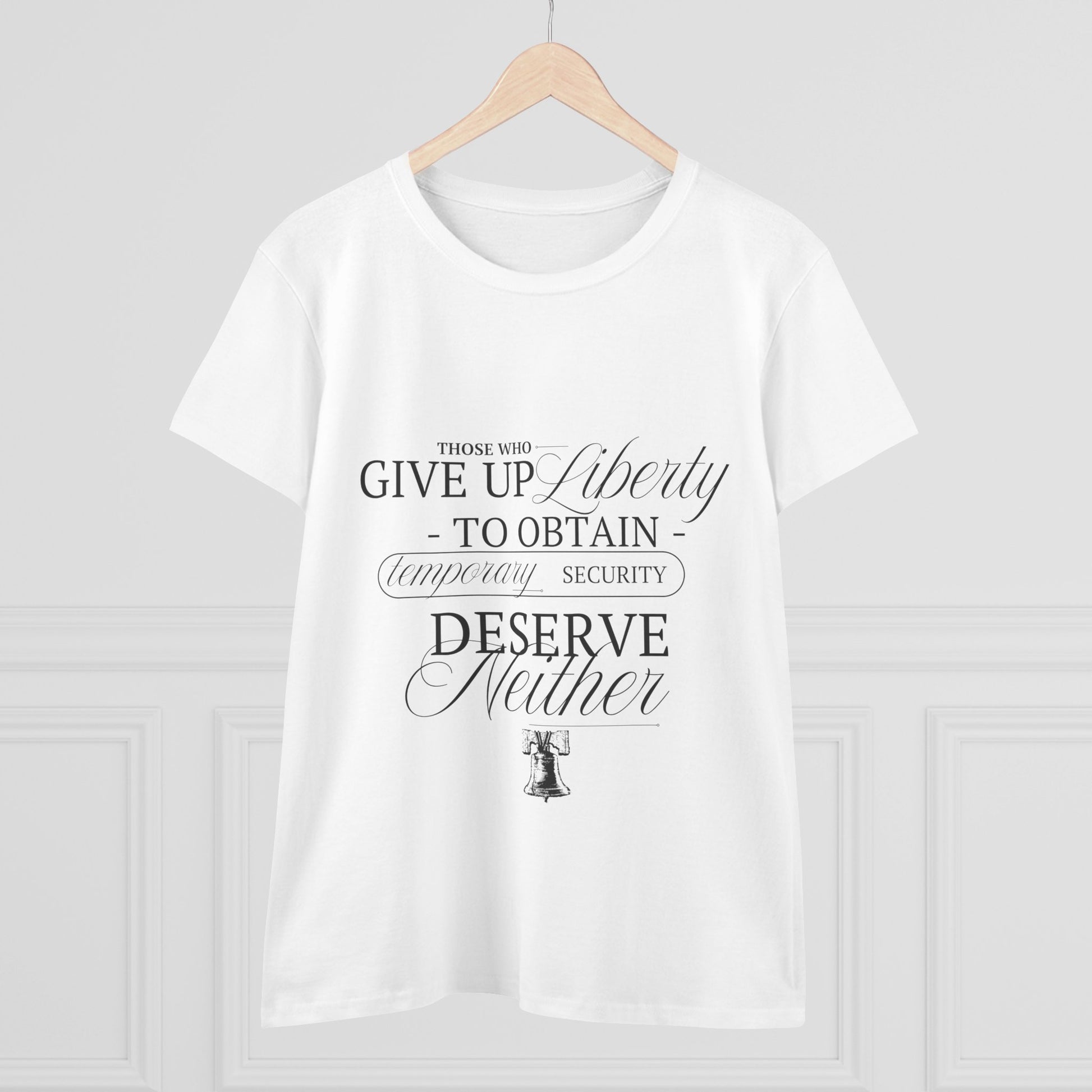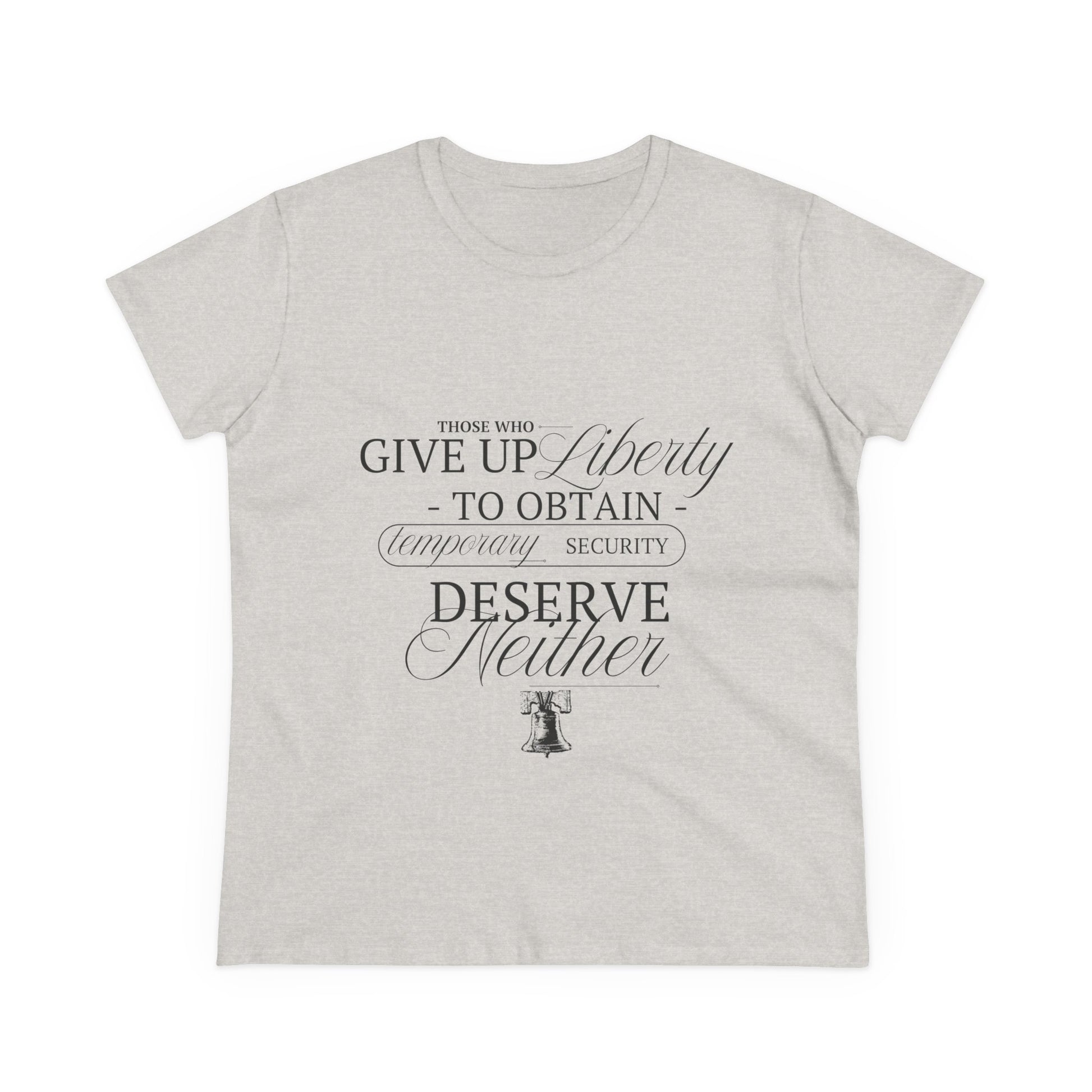 Soft, midweight cotton with a quietly patriotic design. This semi-fitted tee settles comfortably at the shoulders and mid-torso, the kind you reach for when you want something simple that still speaks. A subtle, vintage-inspired typographic print sits centered on the chest, pairing delicate script with classic serif lettering and a small Liberty Bell illustration. It reads like a whispered reminder — thoughtful, restrained, and a little nostalgic. Wear it layered under a cardigan on cool mornings, with high-waisted jeans for a weekend walk, or tucked into a skirt for a low-key statement at a civic event.