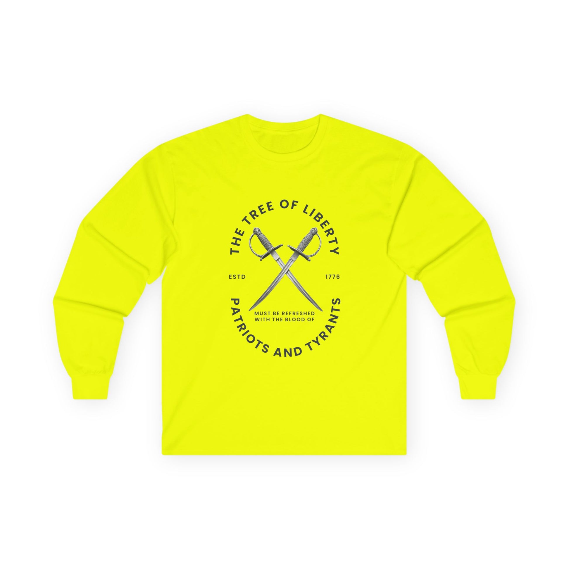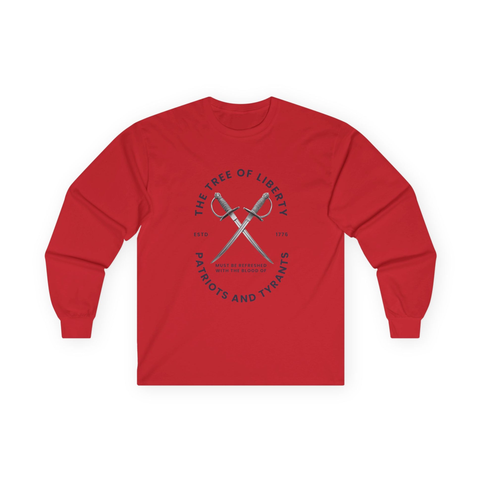 A lived-in long sleeve that reads like a quiet declaration. This medium-weight tee wears like a vintage find — slightly substantial, soft, and made to age well. The chest features a restrained heraldic mark: crossed spears with a ringed motto naming liberty and the line between patriots and tyrants. Sleeved cuffs and a ribbed collar keep the silhouette neat while the tubular knit and taped shoulders hold shape through repeated wear. It settles easily into a weekend routine — layered under a flannel for trail mornings, or alone while you read on the porch — offering a calm, intentional look for someone who favors meaning over flash.