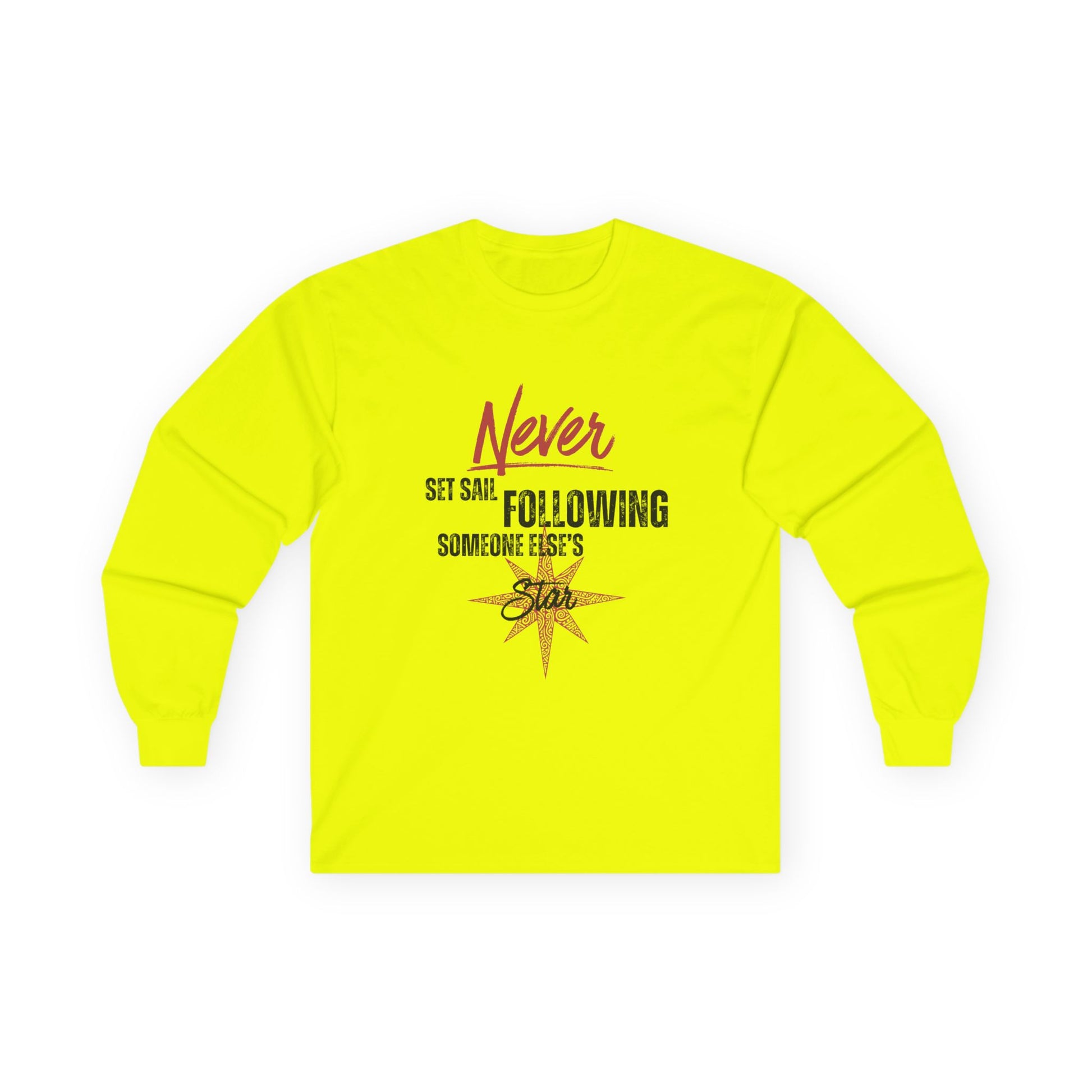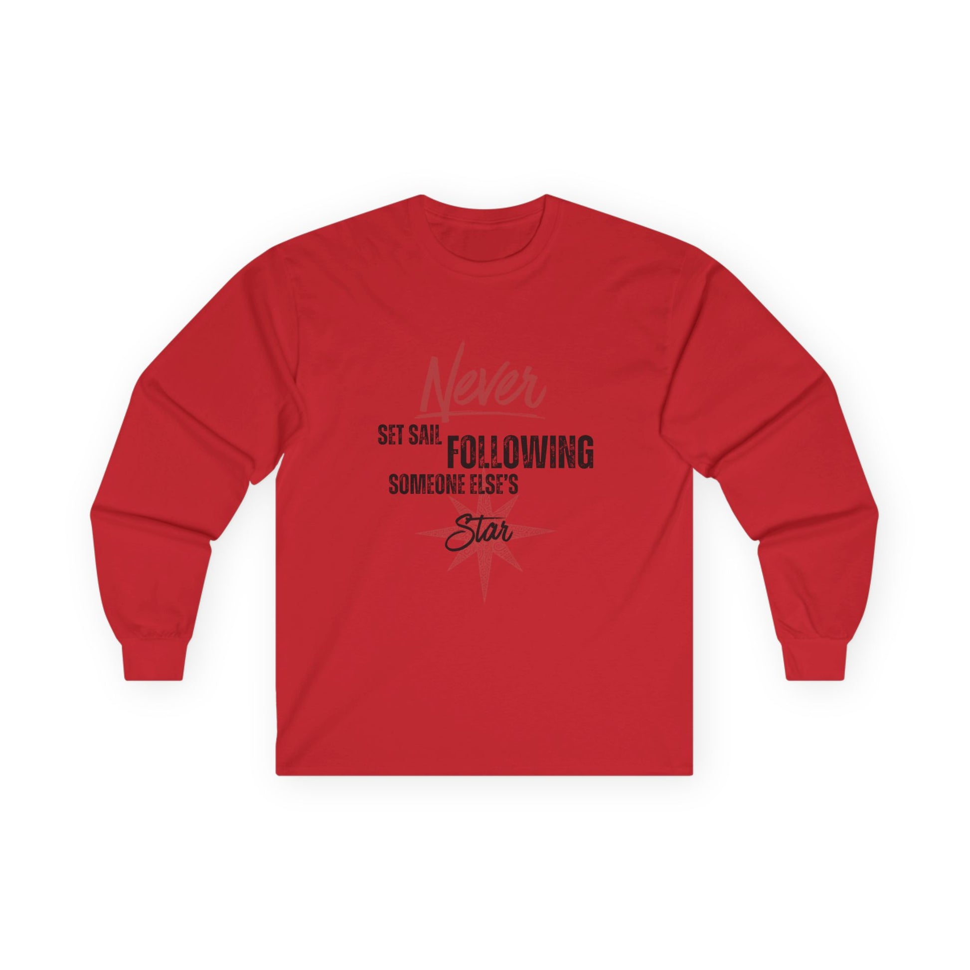 A soft, vintage-feel long sleeve that quietly broadcasts independence. The shirt’s muted compass motif and hand-lettered message — “Never set sail following someone else’s star” — sits centered on a relaxed, classic-fit silhouette. The medium-weight cotton has a thicker, worn-in texture that drapes like a lived-in favorite, while the tubular knit construction keeps lines clean and seams minimal. Ribbed collar and taped shoulders help the tee hold its shape through wear, and cuffed sleeves give a cozy finish. Wear it on foggy morning walks, late-night planning sessions, or while mapping out your next solo adventure — it reads like a quiet reminder to trust your own direction.