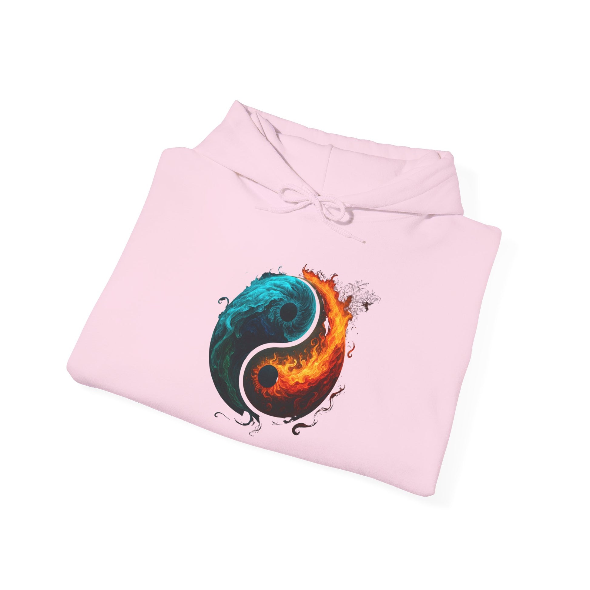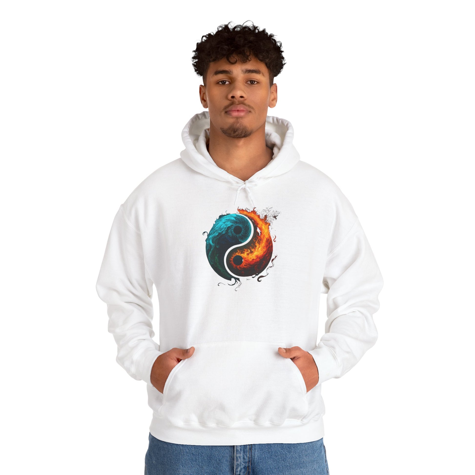 A soft, roomy hoodie that balances calm and spark. The front displays a compact yin-yang motif where ocean-blue waves curl into ember-orange flames — a small symbol that speaks loudly about balance, contrast, and quiet energy. Wear it on foggy morning walks, by the coffee shop window, or layered for a late-night bonfire. The pouch pocket keeps hands warm; the double-lined hood and color-matched drawcord give a tidy, durable finish. Lightweight warmth and a clean white canvas let the art stand out, so the piece reads both subtle and expressive in everyday life.